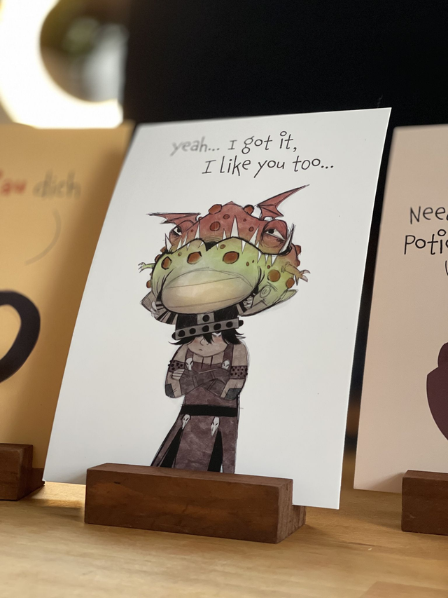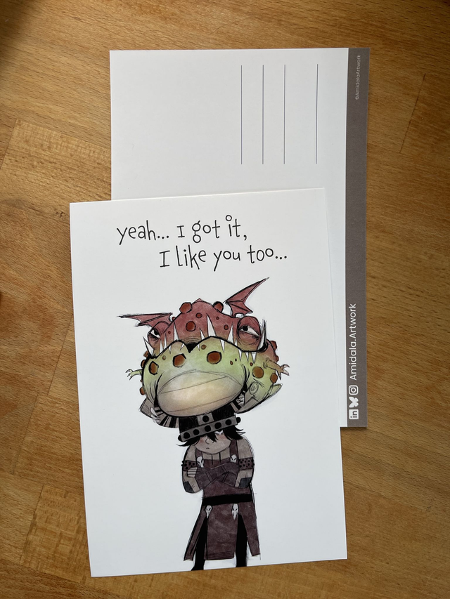 Diese Postkarte ist an einen guten Freund von mir angelehnt. Er tut sich nämlich ziemlich schwer, seine Zuneigung seinen Freunden gegenüber zu zeigen. Manchmal ist das eben so, und das ist auch okay. Es gibt ja auch noch andere Wege, seine Zuneigung zueinander zu zeigen, nicht wahr? Wie zum Beispiel mit dieser Karte hier! Was sich liebt, das neckt sich, oder nicht?